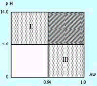 在日本,根據(jù)厚生省告示第 17 號(hào)“容器包裝、充填加壓加熱殺菌食品”的標(biāo)準(zhǔn)中被定義為 如圖 1 所示 pH 值超過 4.6 、且水分活性超過 0.94 的范圍,在充填該類食品進(jìn)行加熱加壓時(shí),必須對(duì)中心部采取以 120 ℃ 、加熱 4 分鐘的方法或與其具有同等效力以上的方法進(jìn)行殺菌。