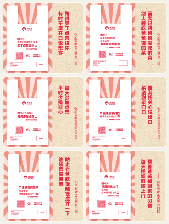 消費(fèi)者除了物質(zhì)需求,還有情感需求。刺激打動(dòng)消費(fèi)者的情感,也能夠驅(qū)動(dòng)購買。而價(jià)值共鳴是提煉賣點(diǎn)最高級(jí)的用法,是情感需求的升級(jí)版。價(jià)值共鳴能夠聚集一批消費(fèi)者,共同為某個(gè)價(jià)值點(diǎn)努力。而你的產(chǎn)品借助價(jià)值點(diǎn)能夠獲得這群消費(fèi)者喜愛。例如父親節(jié)期間,淘菜菜推出了百萬個(gè)帶有花式文案的創(chuàng)意塑料袋到各地團(tuán)點(diǎn)。通過這些文案的輸出,用戶買的不再僅僅是菜了,更是一份對(duì)家庭、對(duì)父親的愛。