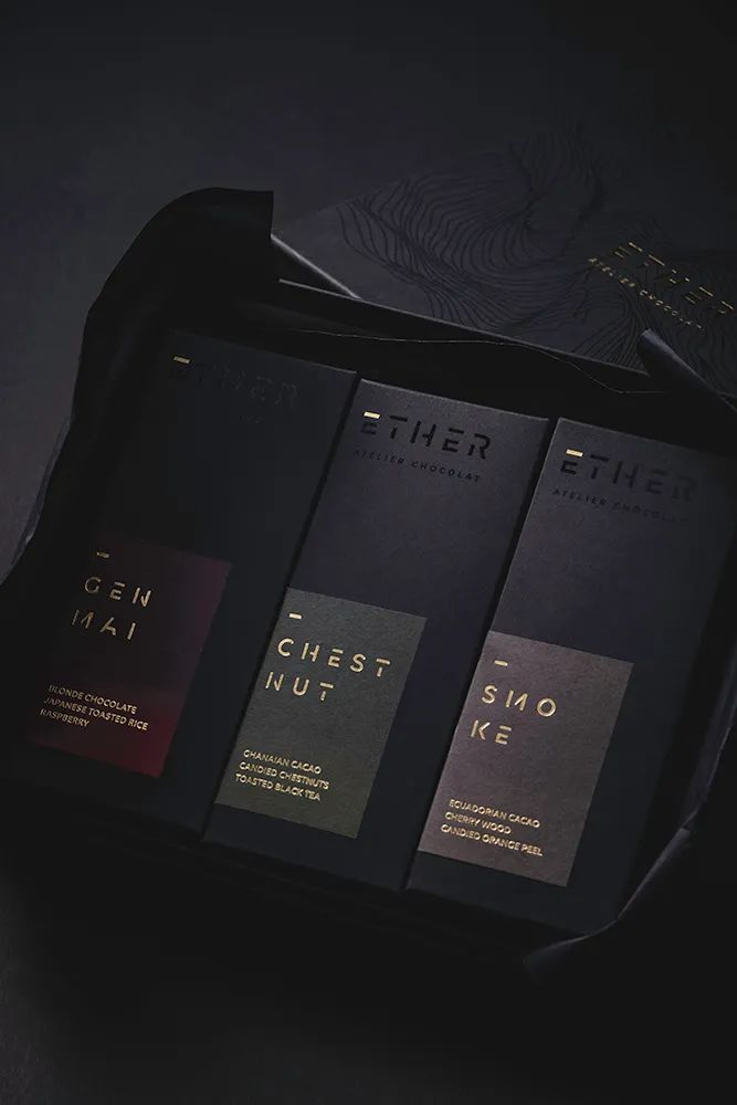 ether atelitr巧克力是來自印度的品牌,他的包裝設(shè)計(jì)使用微妙的黑色和金色美學(xué)以及設(shè)計(jì)的版式反應(yīng)巧克力的純正,體現(xiàn)品牌輕奢的理念。豐富、安靜的細(xì)節(jié)化處理,反映出該巧克力的手工精神和該品牌的市場唯一性。